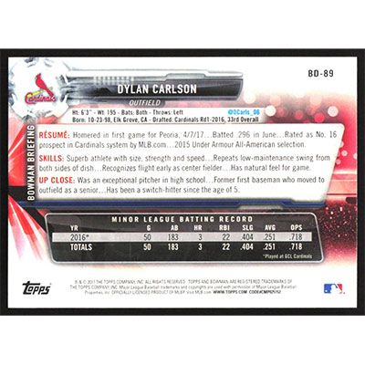 This is a 2017 Bowman Draft Dylan Carlson baseball card. The card is #BD-89 and pictures show condition.