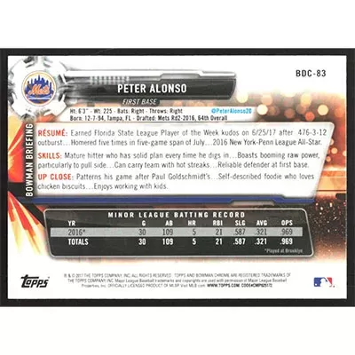 This is a 2017 Bowman Draft Chrome Peter Alonso baseball card. The card is #BDC-83 and pictures show condition.