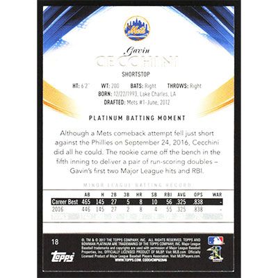 This is a 2017 Bowman Platinum Gavin Cecchini baseball card. The card is #18 and pictures show condition.