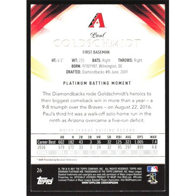 This is a 2017 Bowman Platinum Paul Goldschmidt baseball card. The card is #26 and pictures show condition.