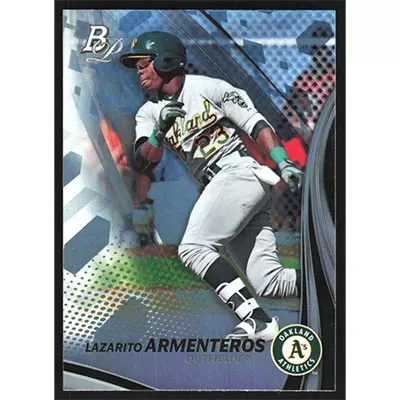 This is a 2017 Bowman Platinum Top Prospects Lazarito Armenteros baseball card. The card is #TP-LA and pictures show condition. Team(s): Oakland Athletics