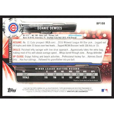This is a 2017 Bowman Prospects Donnie Dewees baseball card. The card is #BP108 and pictures show condition.