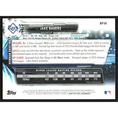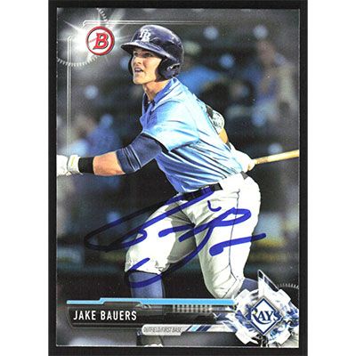 This is a 2017 Bowman Prospects Jake Bauers autographed baseball card. This card has been signed, in blue, by Jake Bauers, and is guaranteed authentic by Ballcardz.com. The card is #BP58 and pictures show condition.