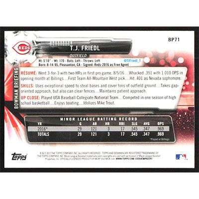 This is a 2017 Bowman Prospects T.J. Friedl baseball card. The card is #BP71 and pictures show condition.
