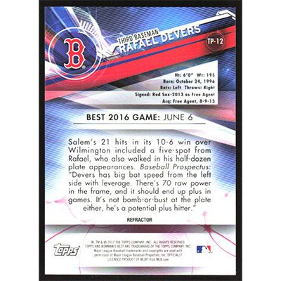 This is a 2017 Bowman's Best Top Prospects Atomic Refractors Rafael Devers baseball card. The card is #TP-12 and pictures show condition. Team(s): Boston Red Sox
