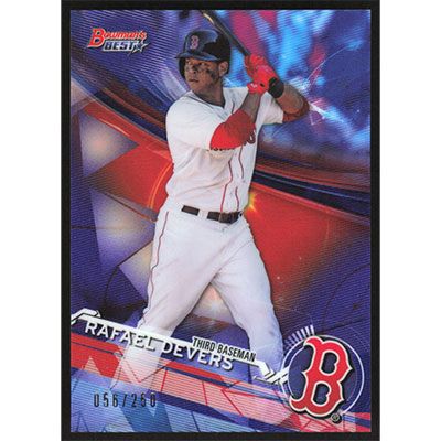 This is a 2017 Bowman's Best Top Prospects Purple Refractors Rafael Devers baseball card. The card is #TP-12 and pictures show condition. This card is limited; #'d 056/250.