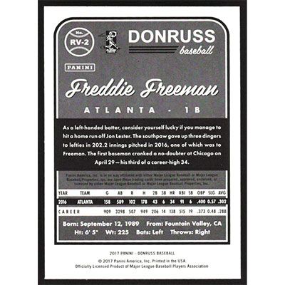 This is a 2017 Donruss '83 Retro Variations Freddie Freeman baseball card. The card is #RV-2 and pictures show condition.