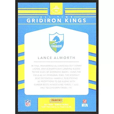 This is a 2017 Donruss All Time Gridiron Kings Lance Alworth football card. The card is #40 and pictures show condition.