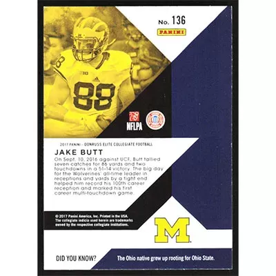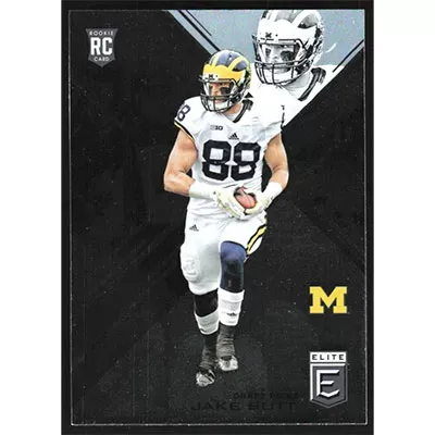 This is a 2017 Elite Draft Picks Jake Butt football card. The card is #136 and pictures show condition.