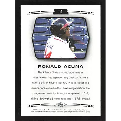 This is a 2017 Leaf Ronald Acuña Retail Exclusive baseball card. The card is #10 and pictures show condition.