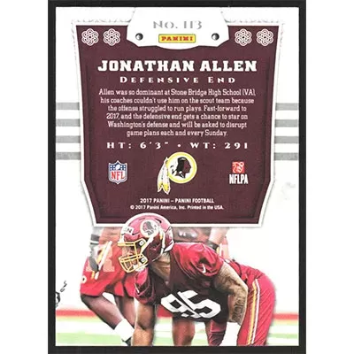 This is a 2017 Panini Chivalry Jonathan Allen football card. The card is #113 and pictures show condition. This card is limited; #'d 105/199. Team: Washington Redskins Rookie Card