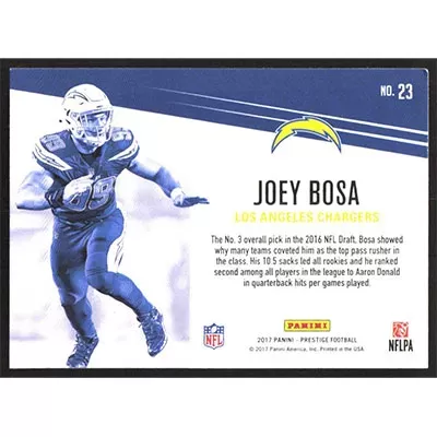 This is a 2017 Panini Prestige Hardwear Joey Bosa football card. The card is #23 and pictures show condition.