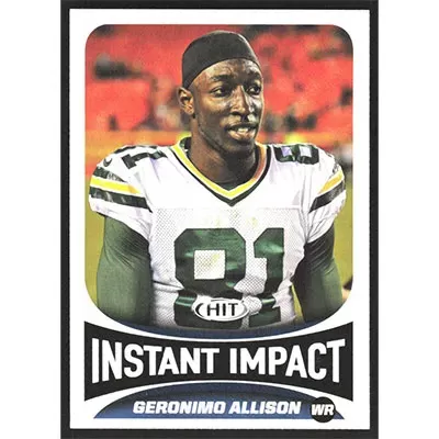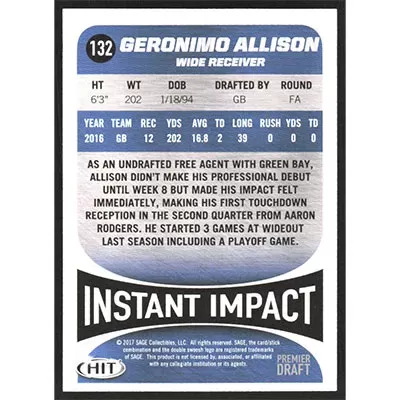 This is a 2017 SAGE HIT Premier Draft Geronimo Allison Instant Impact football card. The card is #132 and pictures show condition. Team: Green Bay Packers Rookie Card