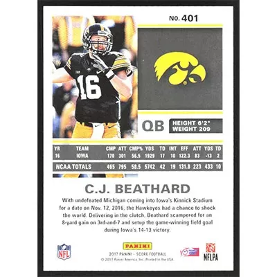 This is a 2017 Score C.J. Beathard football card. The card is #401 and pictures show condition.