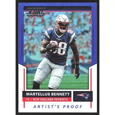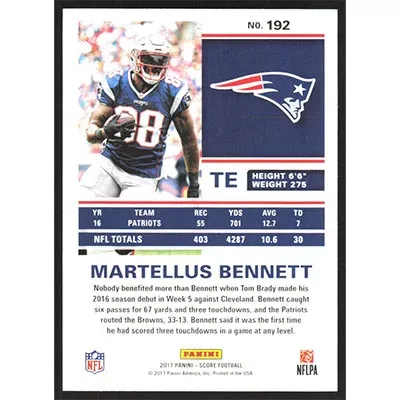 This is a 2017 Score Artist's Proof Martellus Bennett football card. The card is #192 and pictures show condition. This card is limited; #'d 33/35. Team: New England Patriots