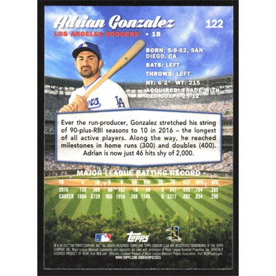 This is a 2017 Stadium Club Adrian Gonzalez baseball card. The card is #122 and pictures show condition.