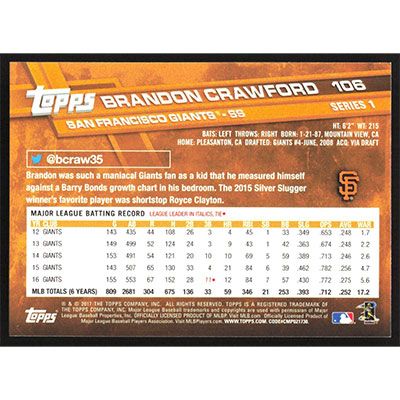 This is a 2017 Topps Brandon Crawford baseball card. The card is #106 and pictures show condition.