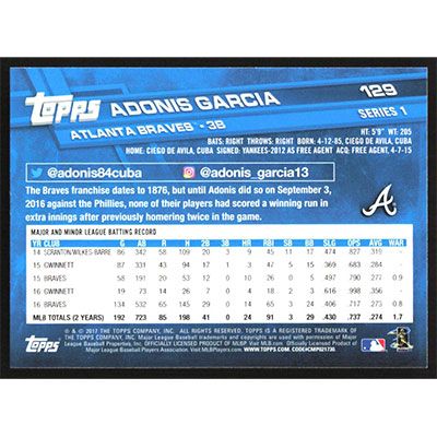This is a 2017 Topps Adonis Garcia baseball card. The card is #129 and pictures show condition.