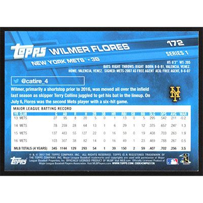 This is a 2017 Topps Wilmer Flores baseball card. The card is #172 and pictures show condition.