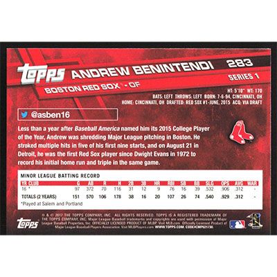 This is a 2017 Topps Andrew Benintendi baseball card. The card is #283 and pictures show condition.