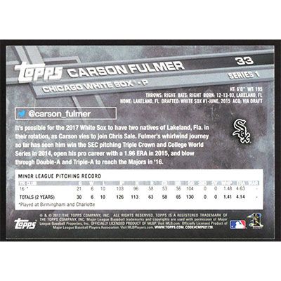 This is a 2017 Topps Carson Fulmer baseball card. The card is #33 and pictures show condition.