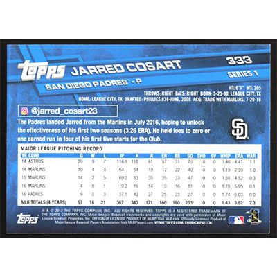 This is a 2017 Topps Jarred Cosart baseball card. The card is #333 and pictures show condition.