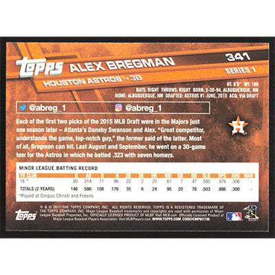 This is a 2017 Topps Alex Bregman baseball card. The card is #341 and pictures show condition.