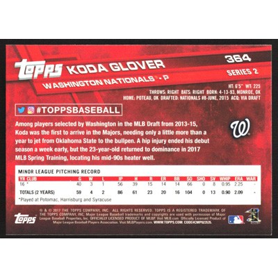 This is a 2017 Topps Koda Glover baseball card. The card is #364 and pictures show condition.