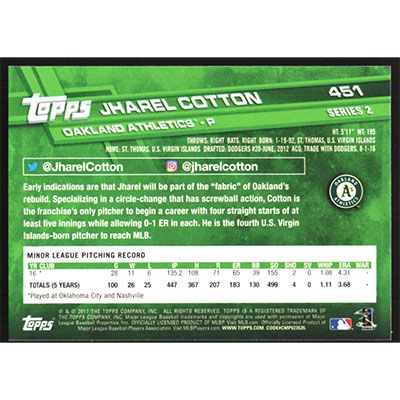 This is a 2017 Topps Jharel Cotton baseball card. The card is #451 and pictures show condition.