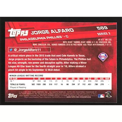 This is a 2017 Topps Jorge Alfaro baseball card. The card is #569 and pictures show condition.