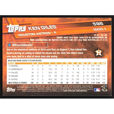 This is a 2017 Topps Ken Giles baseball card. The card is #596 and pictures show condition.