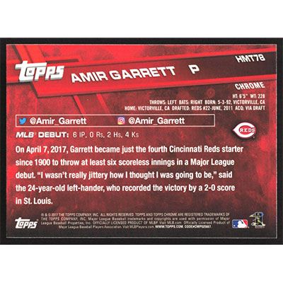 This is a 2017 Topps Chrome Update Amir Garrett Rookie Debut baseball card. The card is #HMT78 and pictures show condition. Team(s): Cincinnati Reds Rookie Card (RC)