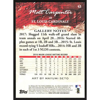 This is a 2017 Topps Gallery Matt Carpenter baseball card. The card is #43 and pictures show condition.