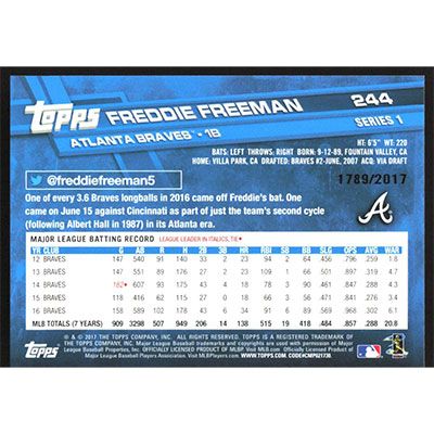 This is a 2017 Topps Gold Freddie Freeman baseball card. The card is #244 and pictures show condition. This card is limited; #'d 1789/2017. Team(s): Atlanta Braves