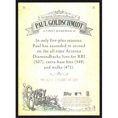 This is a 2017 Topps Gypsy Queen Paul Goldschmidt baseball card. The card is #112 and pictures show condition.