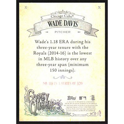 This is a 2017 Topps Gypsy Queen Wade Davis baseball card. The card is #118 and pictures show condition.