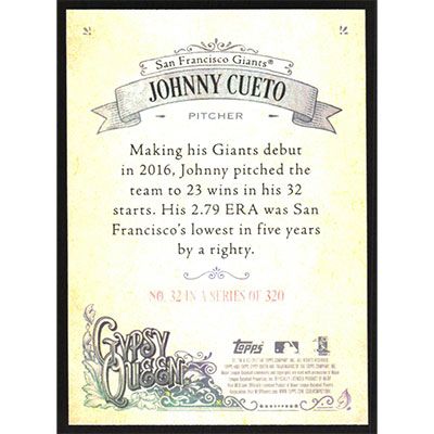 This is a 2017 Topps Gypsy Queen Johnny Cueto baseball card. The card is #32 and pictures show condition.