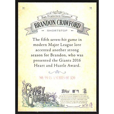 This is a 2017 Topps Gypsy Queen Brandon Crawford baseball card. The card is #99 and pictures show condition.