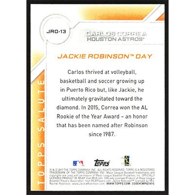 This is a 2017 Topps Jackie Robinson Day Carlos Correa baseball card. The card is #JRD-13 and pictures show condition.