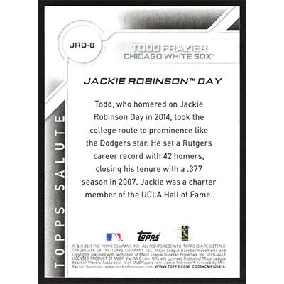 This is a 2017 Topps Jackie Robinson Day Todd Frazier baseball card. The card is #JRD-8 and pictures show condition.