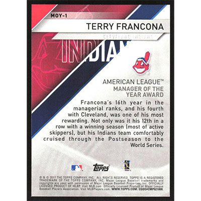 This is a 2017 Topps MLB Awards Terry Francona baseball card. The card is #MOY-1 and pictures show condition.