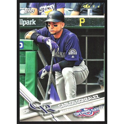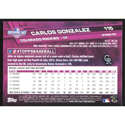 This is a 2017 Topps Opening Day Carlos Gonzalez baseball card. The card is #115 and pictures show condition.