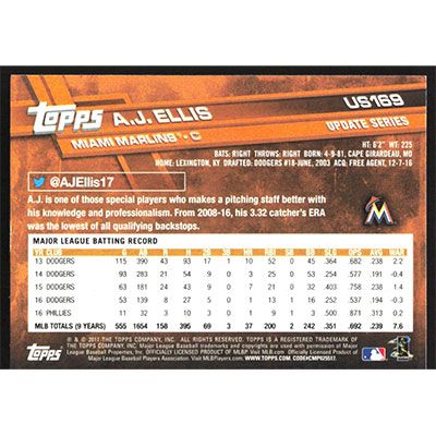 This is a 2017 Topps Update A.J. Ellis baseball card. The card is #US169 and pictures show condition.