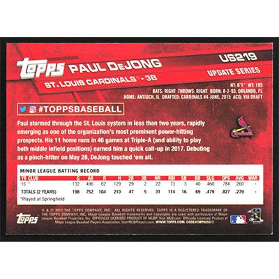 This is a 2017 Topps Update Paul Dejong autographed baseball card. This card has been signed, in blue, by Paul Dejong, and is guaranteed authentic by Ballcardz.com. The card is #US219 and pictures show condition.