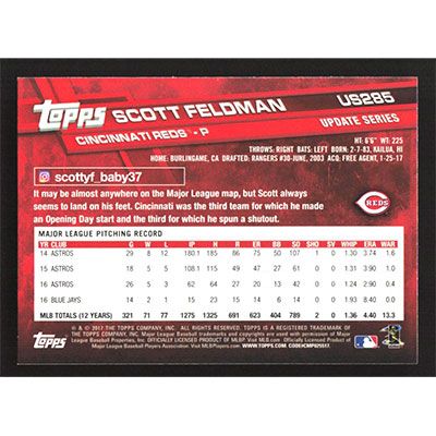 This is a 2017 Topps Update Scott Feldman baseball card. The card is #US285 and pictures show condition.