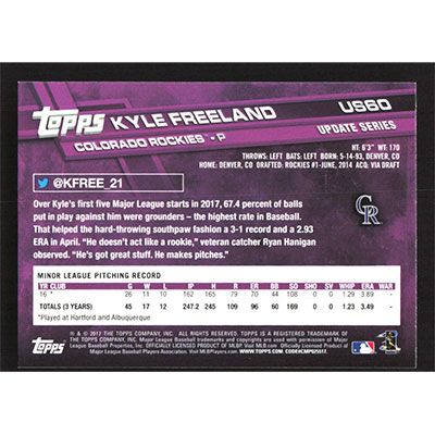 This is a 2017 Topps Update Kyle Freeland baseball card. The card is #US60 and pictures show condition.