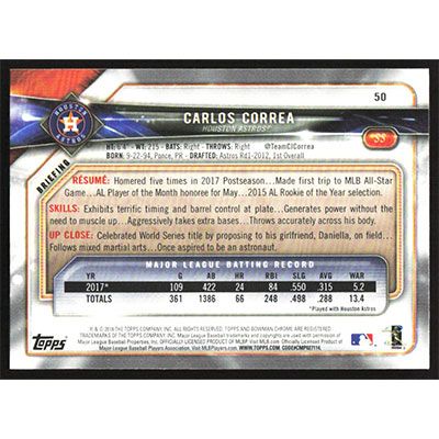This is a 2018 Bowman Carlos Correa baseball card. The card is #50 and pictures show condition.