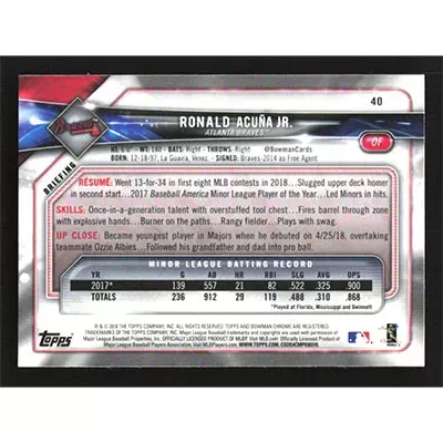 This is a 2018 Bowman Chrome Ronald Acuña Jr. baseball card. The card is #40 and pictures show condition.