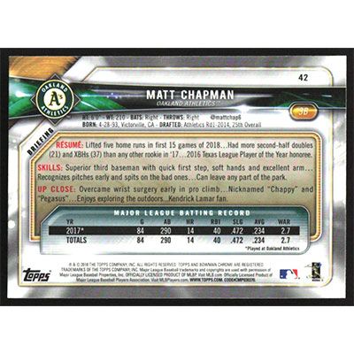 This is a 2018 Bowman Chrome Matt Chapman baseball card. The card is #42 and pictures show condition.