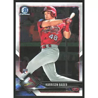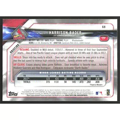 This is a 2018 Bowman Chrome Harrison Bader baseball card. The card is #68 and pictures show condition. Team(s): St. Louis Cardinals Rookie Card (RC)